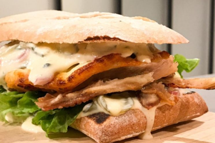 4. Armar el sánguche con la mayonesa con pepinos, lechuga, arriba el pollo con provoleta, palta y un poco más de mayonesa con pepino