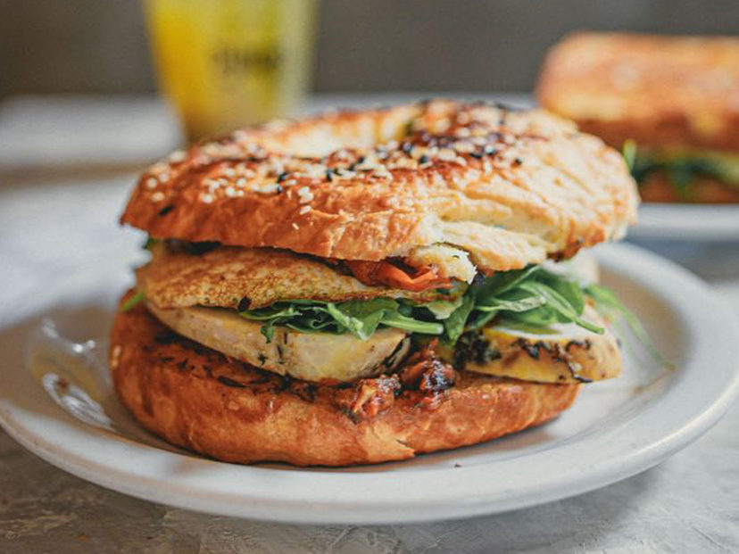 Bagel de pollo asado, palta, huevo, pesto de tomates secos y rúcula