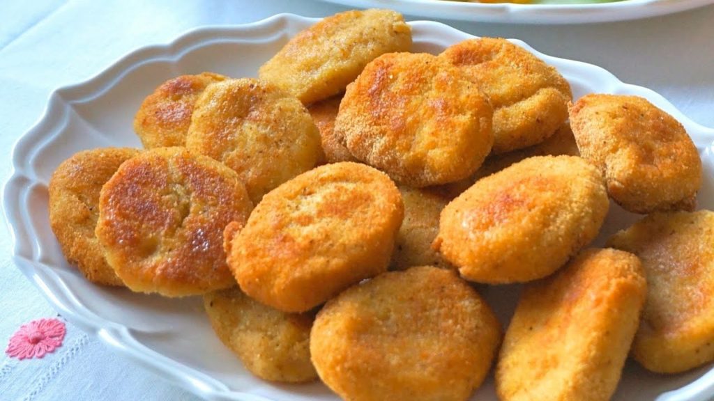 Pasar los nuggets de pollo por huevo y luego por pan rallado. Da igual como tenés las manos, ya es un desastre. La forma que yo les doy, simplemente aplasto un poco las bolitas. Si la masa está bien hecha es muy fácil darle la forma que quieras.