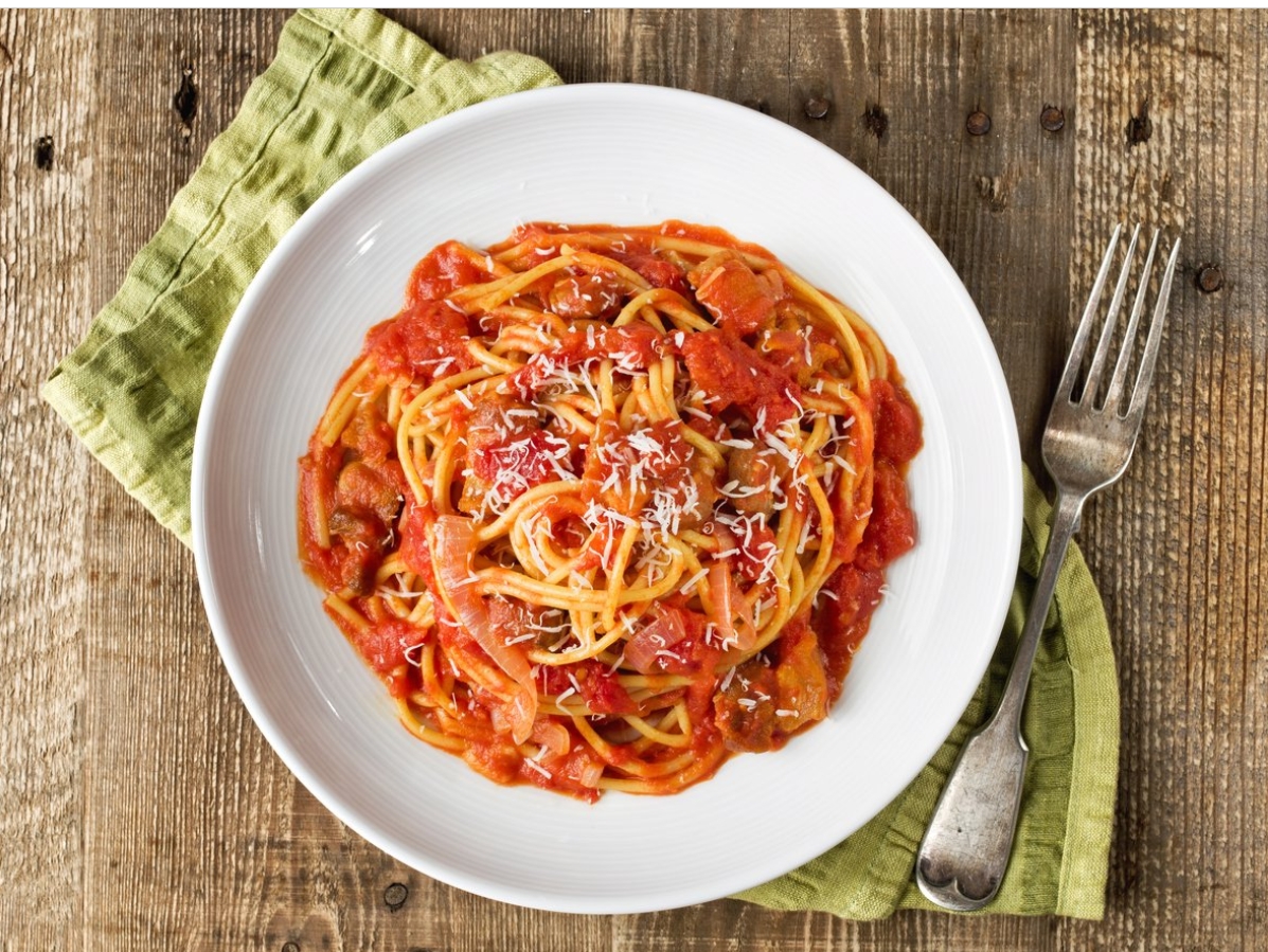 Luego solo hay que escurrir los espaguetis, ponerlos en una fuente y mezclar con la salsa de tomate. Se sirven con queso picorino rallado, pero si no encuentras este queso puedes añadir parmesano o cualquier otro.