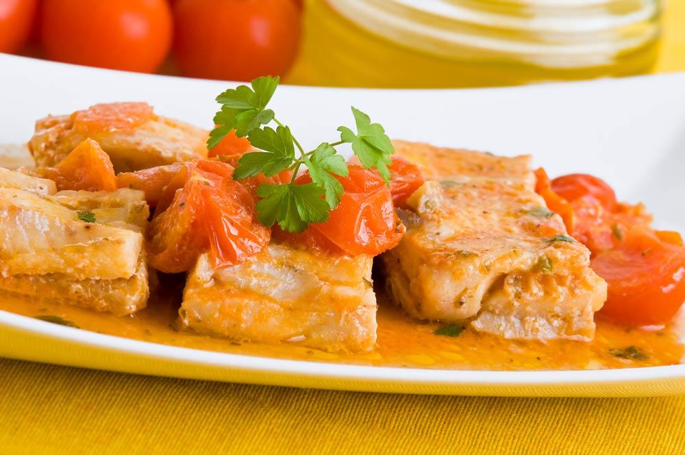 - Pasado el tiempo, bajar el fuego del tomate y colocar arriba los trozos de bacalao. Dejar el calor en mínimo y cocinar por 10 minutos.