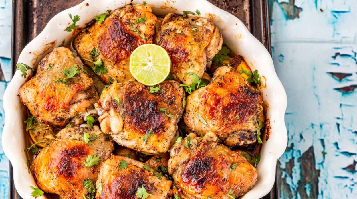 - Hornear en el horno precalentado durante aproximadamente 45-50 minutos, o hasta que los muslos de pollo estén bien cocidos y las patatas estén doradas y tiernas. A mitad de la cocción, voltear los muslos de pollo y mezclar las patatas para asegurar que se cocinen de manera pareja.