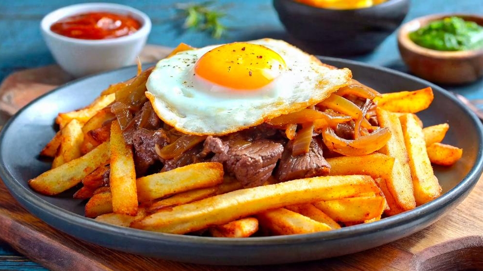 - Freír los huevos y colocarlos sobre la mezcla. Añadir ají y salsa de tomate o kétchup a gusto sobre el plato o en recipientes aparte.