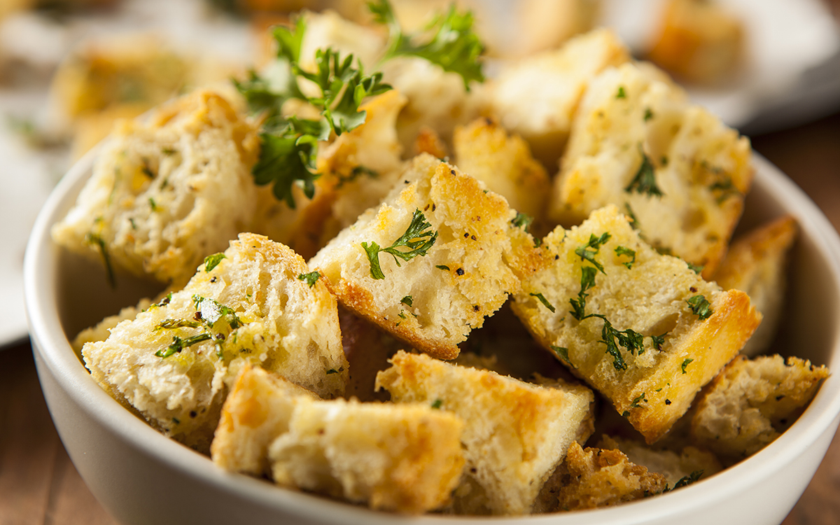 - Remojar los croutons en la salsa. No demasiado tiempo, no deben quedar embebidos porque sino serán demasiado grasosos. Solo meterlos, revolver un par de veces y sacarlos inmediatamente.