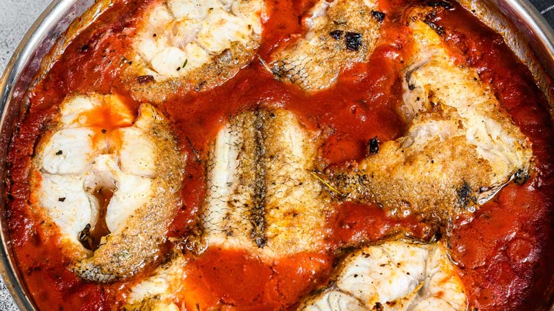 - Incorporar la hoja de laurel y los lomos de bacalao desalados. Cocinar a fuego bajo por alrededor de 20/30 minutos. Una vez cocinado el bacalao, retirar y reservar.