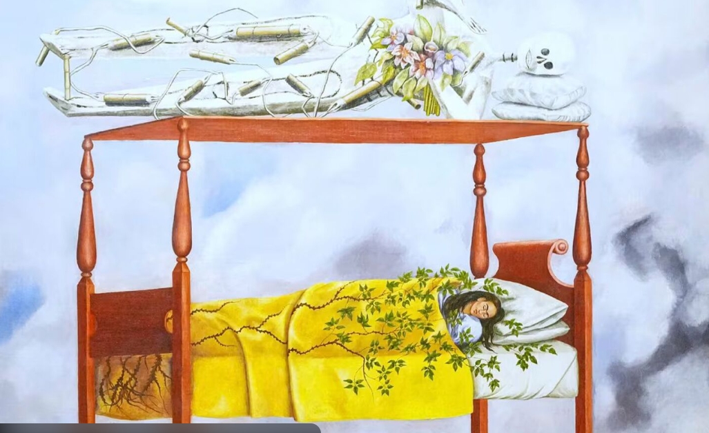 “El sueño (La cama)” muestra a Frida dormida en una cama que parece flotar entre nubes, mientras un esqueleto envuelto en explosivos descansa sobre el dosel. El cuadro combina símbolos de la vida, la muerte y la resiliencia, elementos constantes en la obra de Kahlo. Fue pintado en un momento marcado por su dolor físico y por la turbulencia emocional de su relación con Diego Rivera, lo que convierte a la pieza en una de las más personales de su carrera.