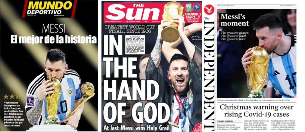 En contrapartida, el matutino de ese país Mundo Deportivo optó por una foto del argentino besando la Copa del Mundo en soledad después de que le habían entregado el premio a Mejor Jugador de la competición: “Messi, el mejor de la historia”. “Argentina es tricampeona tras batir a Francia en una trepidante final (3-3) decidida en los penaltis (4-2), con tres goles de Mbappé y dos de un Leo que corona su carrera”, agregó.