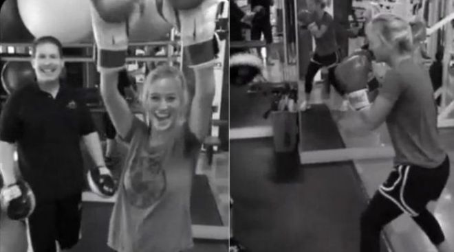 «Estamos acá en Los Ángeles entrenando, haciendo un poco de boxeo», dice la actriz en un video casero que publicó en su cuenta Twitter mientras de fondo suena «Eye of the Tiger», la canción del grupo Survivor que fue escrita por Frankie Sullivan y Jim Peterik a pedido de Sylvester Stallone para Rocky III.