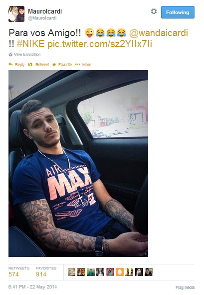 En esta oportunidad, fue Mauro quien se acordó del defensor del Sampdoria con una atrevida imagen que subió a su cuenta de Twitter, en la que se lo ve relajado luciendo una remera que reza en letras muy grandes «Air MAX», que acompañó con la leyenda «Para Vos Amigo!».