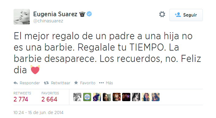 «El mejor regalo de un padre a una hija no es una barbie. Regalale tu TIEMPO. La barbie desaparece. Los recuerdos, no. Feliz dia», escribió la actriz en su cuenta personal de Twitter. El destinatario de esas palabras podría ser Nicolás Cabré, padre de su hija Rufina, aunque el escrito no tiene ningún nombre.