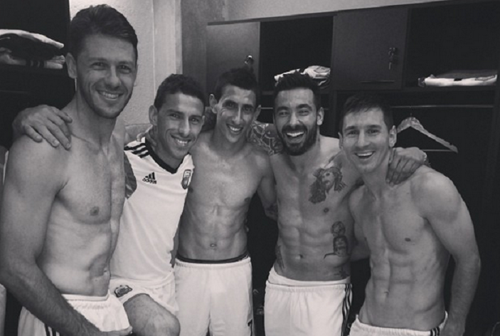 El Pocho Lavezzi, quien entró en el segundo tiempo del partido de Argentina ante Irán, subió una imagen a su cuenta de Instagram que lo muestra a él, a Messi, Di María, Maxi Rodríguez y Demichelis sin la camiseta.