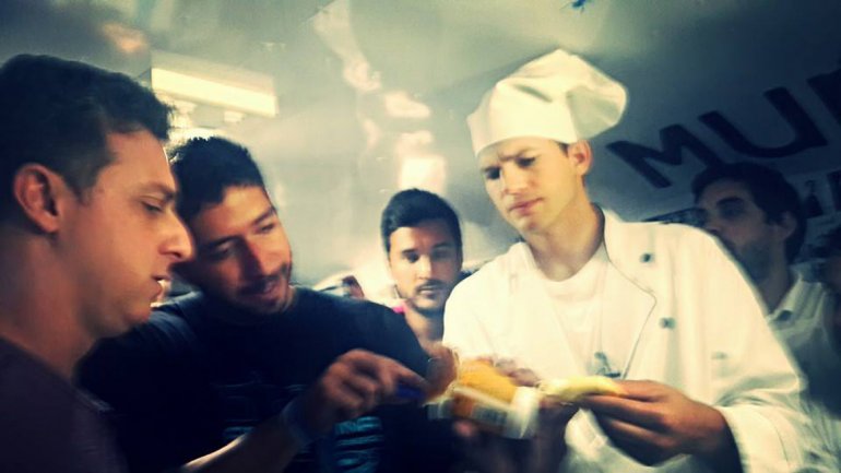 Además de sacarse fotos, Kutcher probó el mate y pan con dulce de leche. Los chicos de Mundial Andando también recibieron a las agrupaciones musicales, Los Tekis y Los Diableros, que tocaron arriba del León, nombre que le pusieron al vehículo.