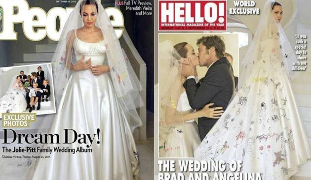 En portada de la Revista People, la novia, mostró un vestido sorprendentemente conservador para su personalidad, decorado por las obras de arte de sus hijos.