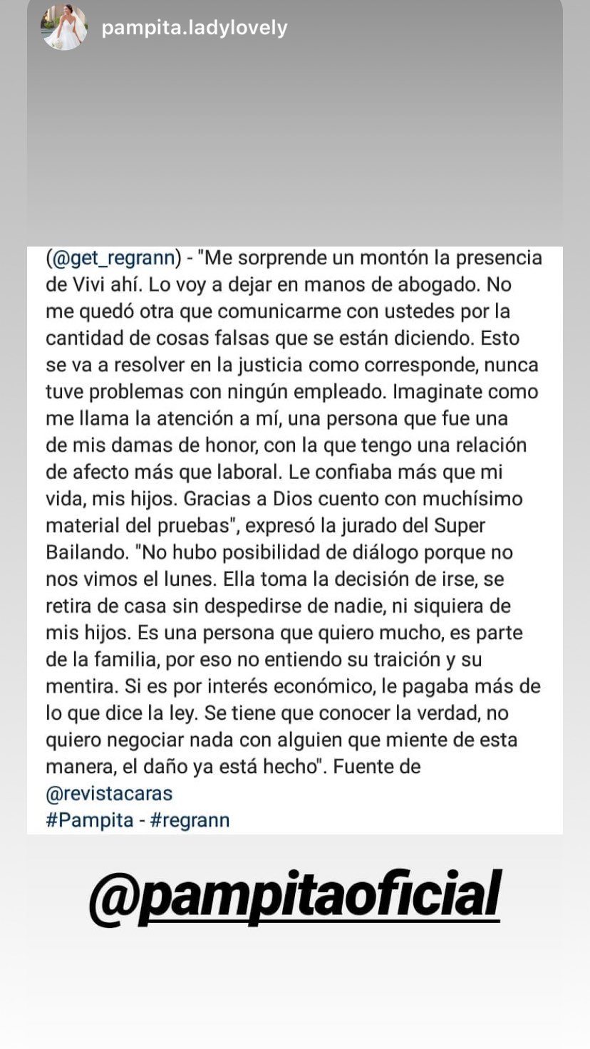 Y así la relación iba y venía según los designios y la voluntad de Viviana”. La mujer aceptó esta versión, y explicó que regresaba a pedirle trabajo porque extrañaba a los hijos de Pampita.