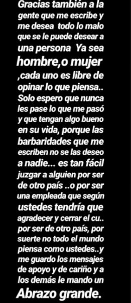 Pero después se defendió de las críticas y agresiones que recibió en las redes: “Gracias también a la gente que me escribe y me desea todo lo malo que se le puede desear a una persona. Ya sea hombre o mujer, cada uno es libre de opinar lo que piensa… Solo espero que nunca les pase lo que me pasó y que tengan algo bueno en su vida, porque las barbaridades que me escriben no se las deseo a nadie”.