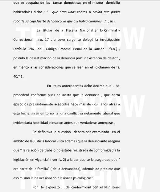 “La cuestión deberá ser examinada en el ámbito de la justicia laboral visto además que la denunciante asegura que ‘la relación de trabajo no estaba registrada de conformidad a la legislación en vigencia’, a la par que se le aseguraba que ‘era parte de la familia’ (de la denunciada), demás de predicar que eso mismo le ha ocasionado ‘lesiones psicológicas’”, continúa el documento.