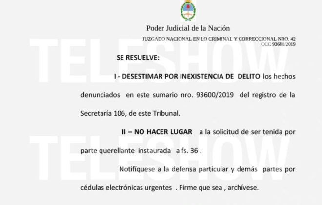La resolución indica “desestimar por inexistencia de delito los hechos denunciados” y “no hacer lugar a la solicitud de ser tenida por parte querellante”.