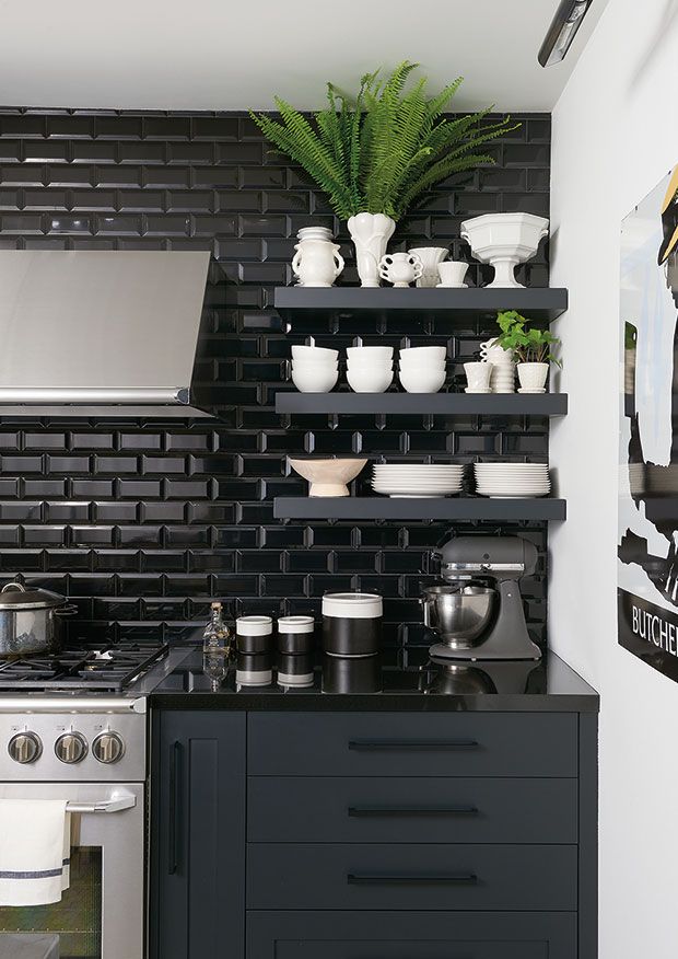 Los azulejos subway blancos son el revestimiento más vendido del mercado. Pero, ¿le echaste un vistazo a los azulejos estilo metro pero en color negro? En acabado brillante y con la junta al tono, le dan un aire neoyorquino a esta cocina que no se priva de unificar la elección con muebles y estantes también en color negro. Sólo los electrodomésticos con frentes cromo marcan contraste.