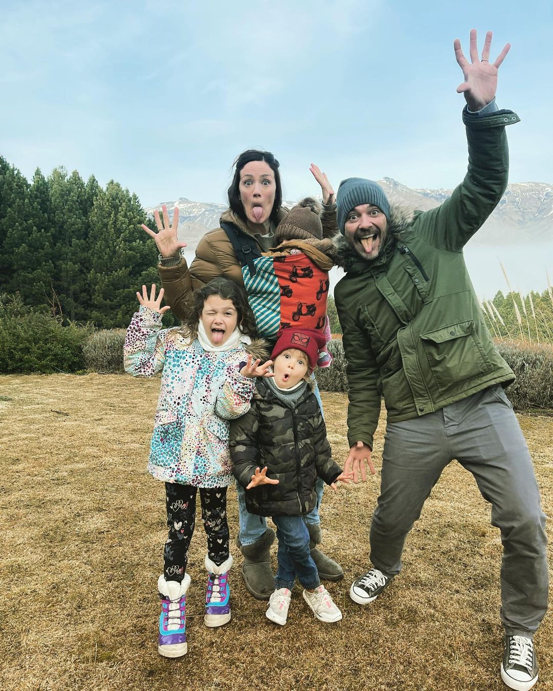“No somos muchos, no somos pocos”, escribió Pedro en su Instagram junto a una foto en la que está posando junto a su mujer, que lleva a Filipa en una mochila de porteo, Olivia y Baltazar. El productor mencionó el estribillo de la popular canción del grupo Los Caligaris, cuya continuación es “… pero estamos todos locos”. En la imagen, y haciendo honor al tema, los integrantes de la familia realizan distintas y divertidas caras y también gesticulan