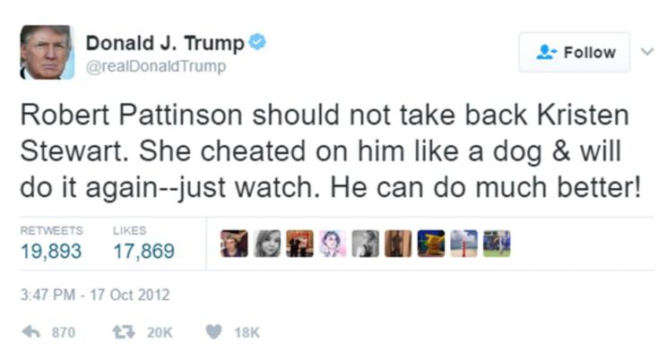 Al día siguiente se difundieron unas fotos de Kristen besándose con Rupert Sanders, el director de la nueva película de Stewart, Blancanieves y la leyenda el cazador, que además era casado y padre de dos hijos. El escándalo fue mayúsculo. Hasta Donald Trump -que en ese momento no era presidente pero ya era mediático- tuiteó: “Robert Pattinson no debería volver con Kristen Stewart. Le puso los cuernos como a un perro y lo hará otra vez. Y si no, miren. ¡Puede encontrar a alguien mucho mejor!”.