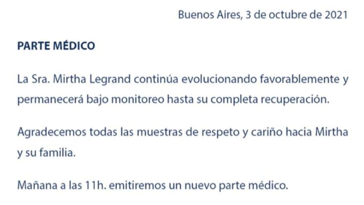 El escrito continúa: “Agradeciendo todas las muestras de respeto y cariño hacia Mirtha y su familia. Mañana a las 11 horas. emitiremos un nuevo parte médico”.