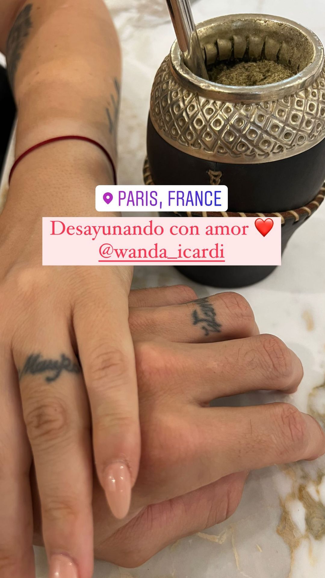 Por último, el más reciente gesto virtual de Icardi para con Wanda es una historia de Instagram donde se ven las manos entrelazadas de ambos y el mensaje: “Desayunando con amor”, que escribió Mauro junto a un corazón y arrobando a la empresaria mediática. En la foto, además, se ve un mate y los dedos anulares de los dos, en los que tienen el nombre de cada uno tatuado, como alianza de matrimonio.