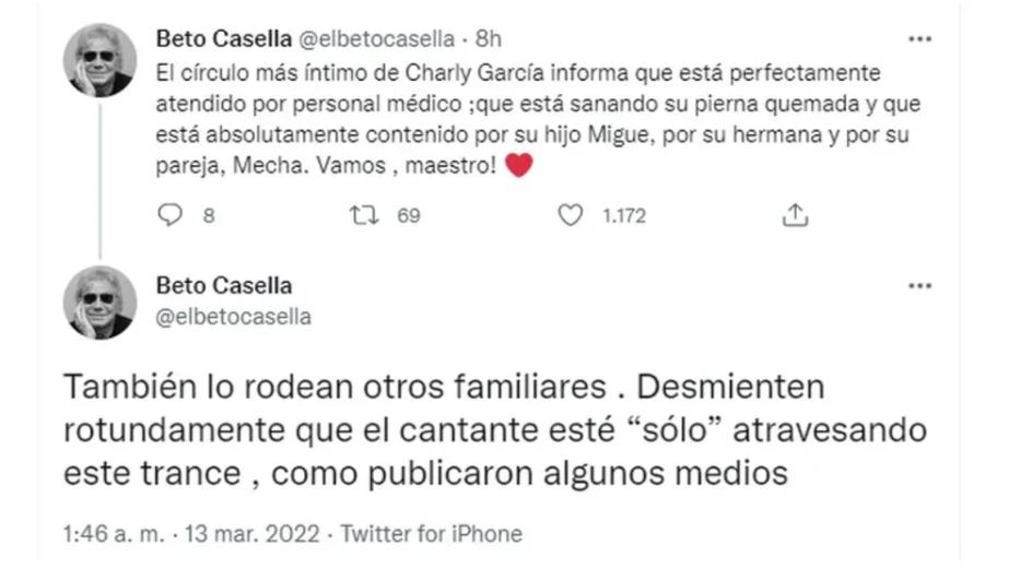 En tanto, en las últimas horas, quien dio información sobre el músico fue Beto Casella. “El círculo más íntimo de Charly García informa que está perfectamente atendido por personal médico; que está sanando su pierna quemada y que está absolutamente contenido por su hijo Migue, por su hermana y por su pareja, Mecha ¡Vamos , maestro!”, escribió el conductor de Bendita en su cuenta de Twitter. Y agregó: “También lo rodean otros familiares. Desmienten rotundamente que el cantante esté ´solo´ atravesando este trance, como publicaron algunos medios”.