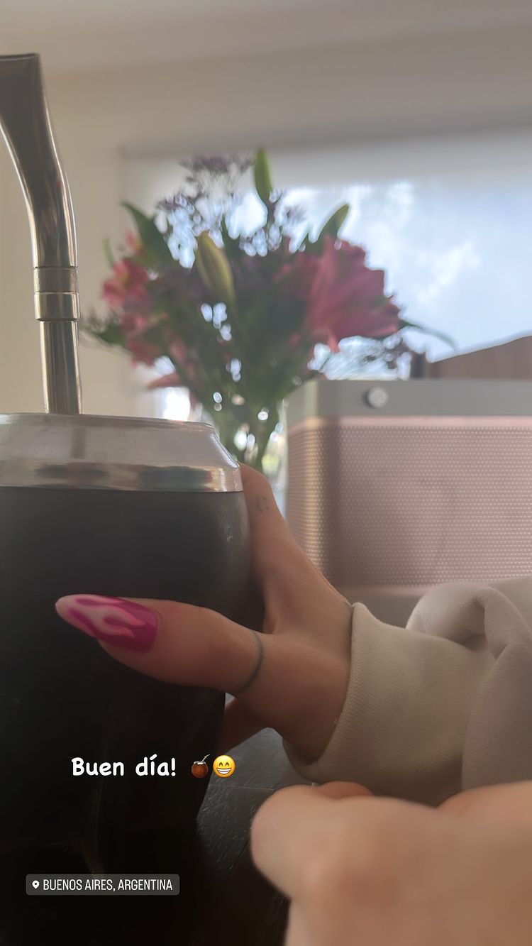 “Buen día”, escribió el mediocampista de Atlético de Madrid en la historia que publicó y en la que se ve una mano con uñas rosas sosteniendo un mate. Además, agregó que la fotografía fue tomada en Buenos Aires. Si bien rápidamente se dedujo que la mano era de Tini, lo que lo confirmó fue otra historia que compartió la cantante.