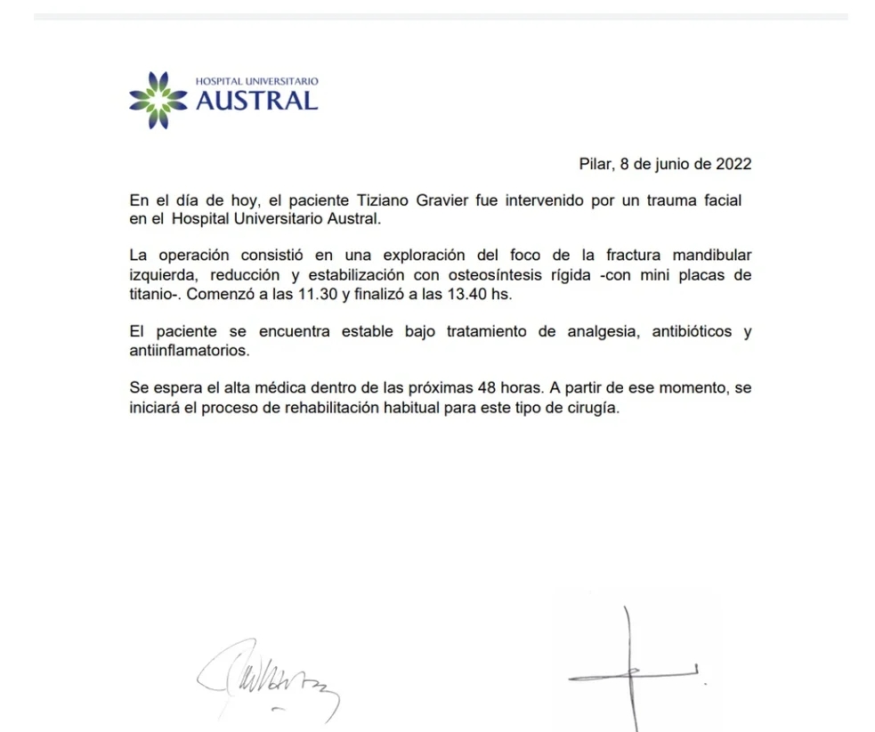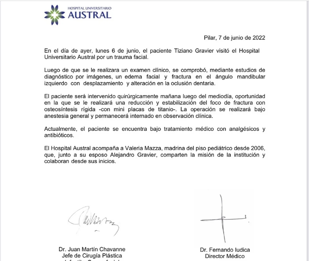 En la madrugada del domingo 5 de junio, Tiziano Gravier fue golpeado por dos jóvenes a la salida de un boliche de Rosario. El hijo de Valeria Mazza y Alejandro Gravier estaba con su hermano Benicio y dos amigas cuando fue agredido. Debido al impacto, el deportista de 20 años fue derivado al Hospital Universitario Austral de la localidad de Pilar en el Gran Buenos Aires, donde se le realizó una intervención quirúrgica el pasado miércoles y, poco más de 24 horas después, fue dado de alta para continuar con la recuperación en su domicilio.