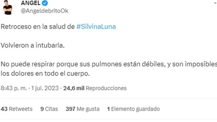 Desde ese momento, sus amigos y allegados se hicieron eco de este pedido y se sumaron a las cadenas de oración por la modelo. Por su parte, su amigo Ángel De Brito también informó sobre su delicado estado de salud. “Retroceso en la salud de Silvina Luna. Volvieron a intubarla. No puede respirar porque sus pulmones están débiles, y son imposibles los dolores en todo el cuerpo”, escribió el periodista desde su cuenta oficial de Twitter.