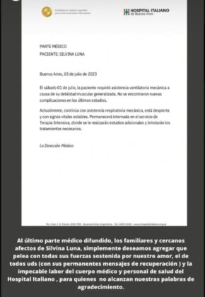 Parte médico del Hospital Italiano sobre Silvina Luna