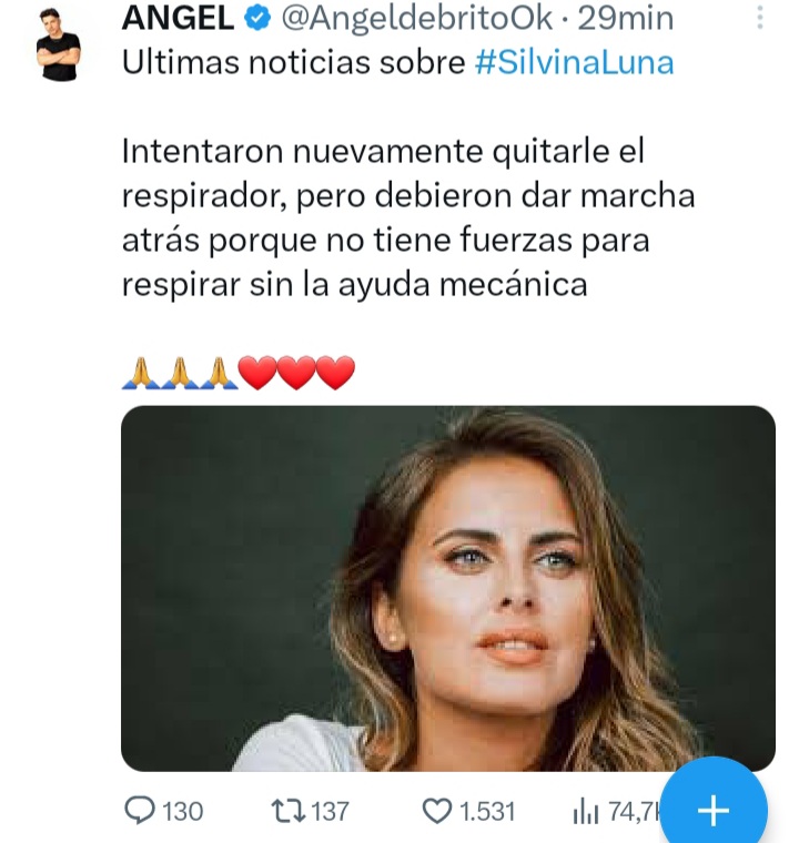 InicioFamososAngel Debrito dio detalles del estado de salud de Silvina Luna Angel Debrito dio detalles del estado de salud de Silvina Luna Famosos Publicada el 04 Jul 2023 por Redaccion FacebookTwitterPinterestWhatsApp Etiquetaestado de salud de silvina lunasalud de Silvina Luna Más recientes Famosos Sofía Pachano fue mamá: nació Vito, su primer hijo con Santiago Ramundo Sofía Pachano y Santiago Ramundo se convirtieron en padres por primera vez con la... 20 enero, 2026 Famosos Esteban Mirol explotó contra MasterChef Celebrity: “me maltrataron” Esteban Mirol rompió el silencio tras su eliminación en el repechaje de MasterChef Celebrity... 20 enero, 2026 Famosos Luciano Castro: “Perdí al amor de mi vida” y la crisis con Griselda Siciliani Luciano Castro atraviesa uno de los momentos más delicados de su vida personal. En... 20 enero, 2026 Famosos David Beckham evitó hablar sobre las declaraciones de su hijo Brooklyn En medio del escándalo familiar que rodea a los Beckham, David Beckham fue consultado... 20 enero, 2026 También pueda interesarte: Famosos Salud de Silvina Luna: dio positivo de coronavirus Según reveló Andrea Taboada en DDM, ahora se presentaría un nuevo cuadro de salud. Silvina... 22 agosto, 2023 TV Ximena Capristo habló sobre Silvina Luna: “Es difícil ver a una amiga postrada en una cama sin poder salir adelante” “Hablaba muy despacito”, dijo sobre la ex Gran Hermano Ximena Capristo lloró al hablar de la... 18 agosto, 2023 Famosos Parte médico del Hospital Italiano sobre Silvina Luna Además, precisaron que el 10 de agostó ingresó a terapia intensiva por “un cuadro... 18 agosto, 2023