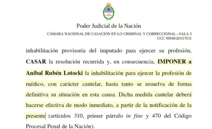 La decisión fue tomada por la Sala 3 de la Cámara nacional de Casación, a pedido del fiscal Sandro Abraldes y de Fernando Burlando, que fue el principal impulsor para que se haga efectiva la inahbilitación. De esta manera, Lotocki no podrá seguir atendiendo en ningún punto del país