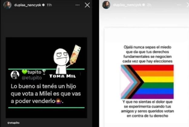 “Lo bueno si tenés un hijo que vota a Milei es que vas a poder venderlo”, reza el primer posteo compartido en sus historias de Instagram, que pertenece a la cuenta de la red social conocida como Twitter por parte del usuario @etupito. Otro de los mensajes compartidos, que incluye una bandera de la comunidad LGBT, reza: “Ojalá nunca sepas el miedo que da que tus derechos fundamentales se negocien cada vez que hay elecciones”, para luego rematar: “Y que no sientas el dolor que se experimenta cuando tus amigos y seres queridos votan en contra de tu derecho”.