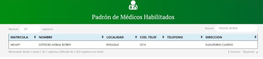 Tal como se puede observar con una simple búsqueda pública en el Colegio de Médicos local, Aníbal Rubén Lotocki figura como “médico habilitado” bajo su matrícula provincial “01697″.