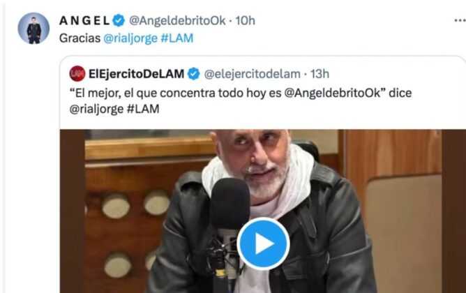 El periodista estuvo como invitado en el ciclo Después de la tormenta (Futurock), conducido por Matías Castañeda y María Del Mar Ramón (actual novia de Rial), y hablar sobre los líderes en el rubro de farándula y espectáculo, Jorge manifestó: «Ángel es hoy el mejor, el concentra todo. Es el que toma un poco la posta de lo que éramos nosotros en Intrusos».