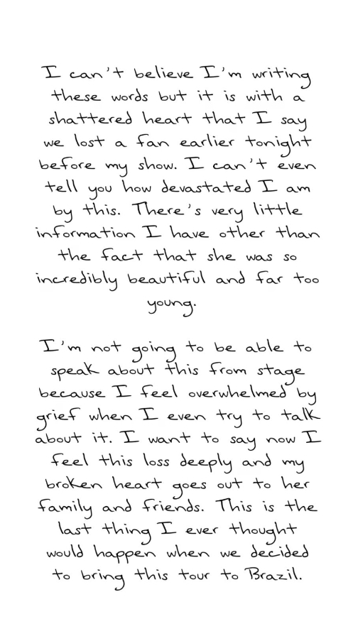 Luego de enterarse de esta noticia, la cantante publicó en sus historias de Instagram un triste mensaje: «No puedo creer que esté escribiendo estas palabras, pero es con el corazón destrozado que digo que perdimos a una fan esta noche antes de mi show. No les puedo explicar lo devastada que estoy tras esto. Tengo muy poca información aparte del hecho de que era increíblemente hermosa y demasiado joven».