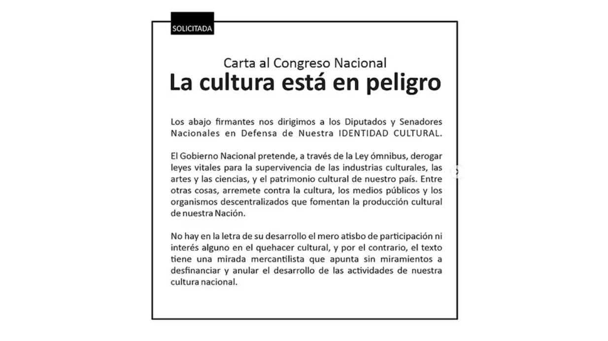 “Carta al Congreso Nacional. La cultura está en peligro”, titularon en el pedido que fue publicado por el Frente de Soberanía Cultural, el cual está dirigido principalmente para diputados y senadores quienes deberán debatir y votar a favor o en contra de estas nuevas medidas que se quieren impulsar. “En defensa de nuestra identidad”, sigue el mensaje de los artistas quienes aseguran que esta nueva política “afectará a las industrias culturales y en sí al arte argentino”.