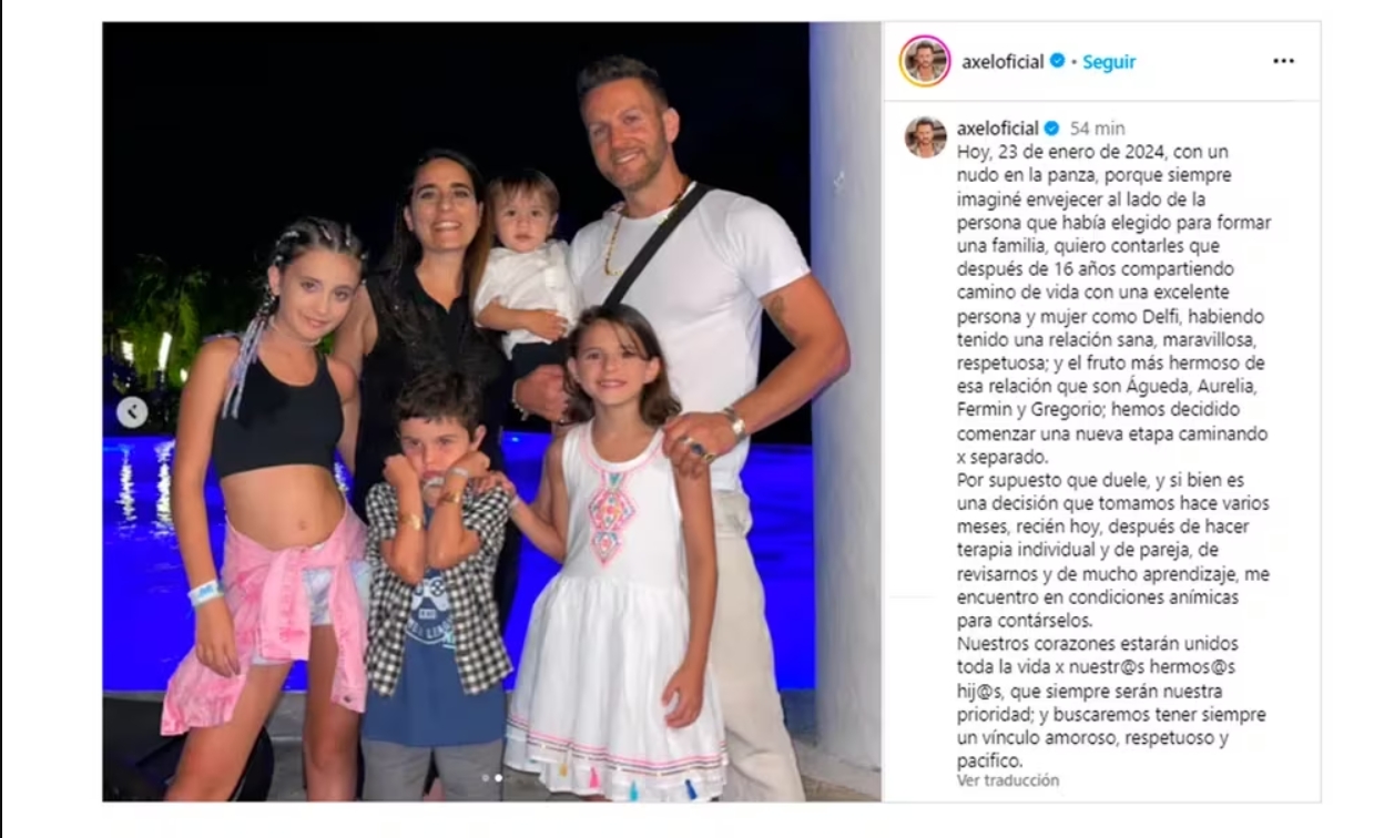 Hoy, 23 de enero de 2024, con un nudo en la panza, porque siempre imaginé envejecer al lado de la persona que había elegido para formar una familia, quiero contarles que después de 16 años compartiendo camino de vida con una excelente persona y mujer como Delfi, habiendo tenido una relación sana, maravillosa, respetuosa; y el fruto más hermoso de esa relación que son Águeda, Aurelia, Fermín y Gregorio; hemos decidido comenzar una nueva etapa caminando por separado”, expresó el cantante en su cuenta de Instagram junto a dos postales familiares.