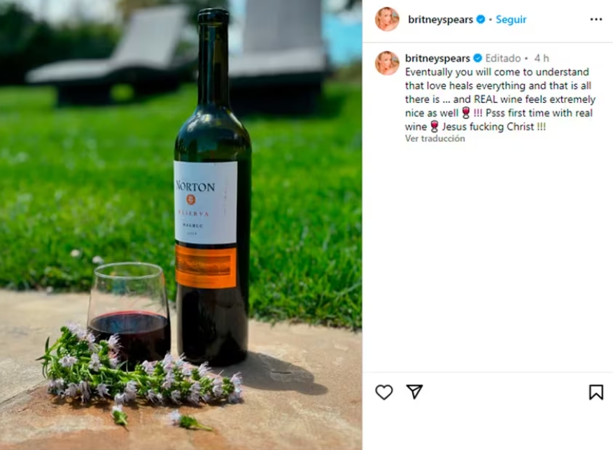 “Con el tiempo llegarás a entender que el amor lo cura todo y que eso es todo lo que hay… ¡¡¡Y el vino REAL también se siente extremadamente bien!!!”, escribió Britney, con mayúsculas textuales y muchos emojis de copas en el epígrafe de la foto. Incluso, hasta se animó a calificar la bebida argentina. “Pfff, primera vez con vino de verdad. ¡Jesus fucking Christ!”, certificó la intérprete de éxitos pop como “Oops, I Did It Again” y “Baby One More Time”, entre otros.
