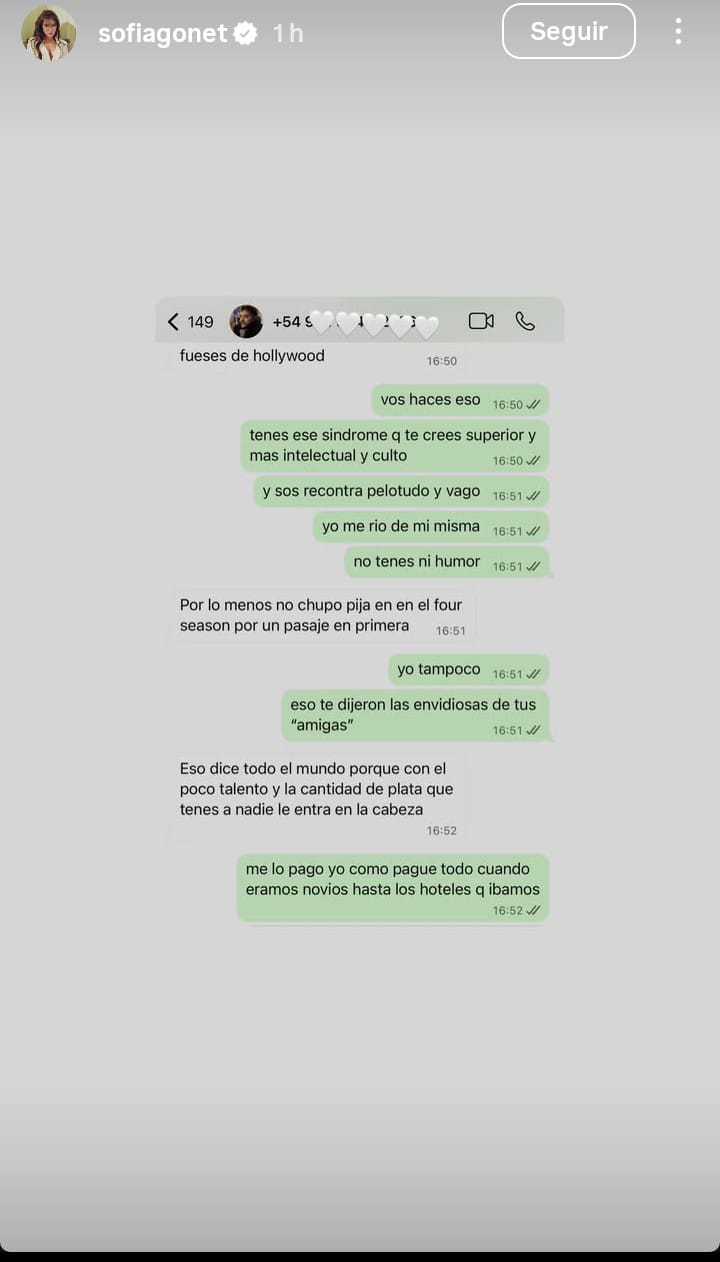 En los chats difundidos, Pettinato descalifica a Gonet con frases como que “se cree Angelina Jolie” y la insulta en reiteradas oportunidades. La influencer no se quedó atrás y cuestionó su comportamiento, su forma de vida y su actitud durante la relación, elevando el tono del intercambio.