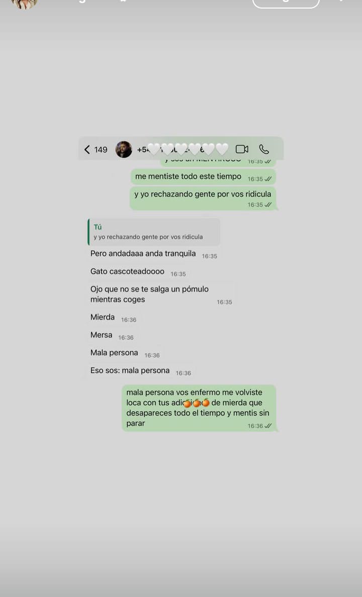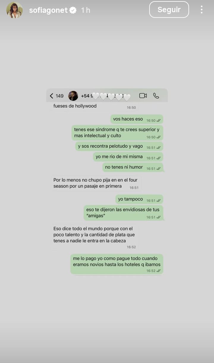 En los chats difundidos, Pettinato descalifica a Gonet con frases como que “se cree Angelina Jolie” y la insulta en reiteradas oportunidades. La influencer no se quedó atrás y cuestionó su comportamiento, su forma de vida y su actitud durante la relación, elevando el tono del intercambio.