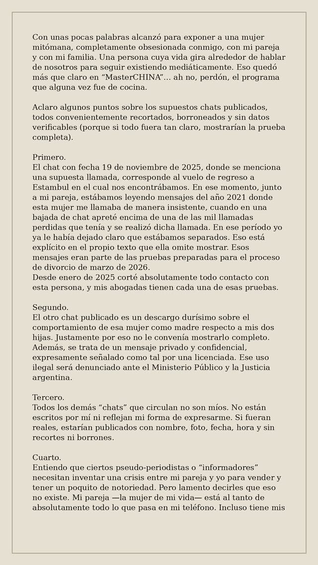 Sobre una supuesta llamada reciente fechada el 19 de noviembre de 2025, explicó que se trató de un error técnico ocurrido mientras revisaba mensajes del año 2021, que formaban parte de las pruebas preparadas para el proceso de divorcio previsto para marzo de 2026. Según indicó, desde enero de 2025 no mantiene ningún tipo de contacto con su exmujer y remarcó que sus abogadas cuentan con pruebas de ello.