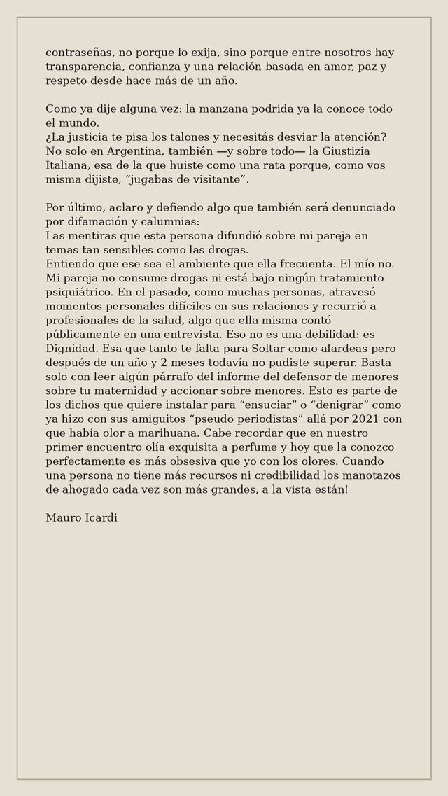 El descargo cerró con la firma de Mauro Icardi, dejando en claro que el conflicto judicial y mediático con Wanda Nara sigue escalando y promete nuevos capítulos.