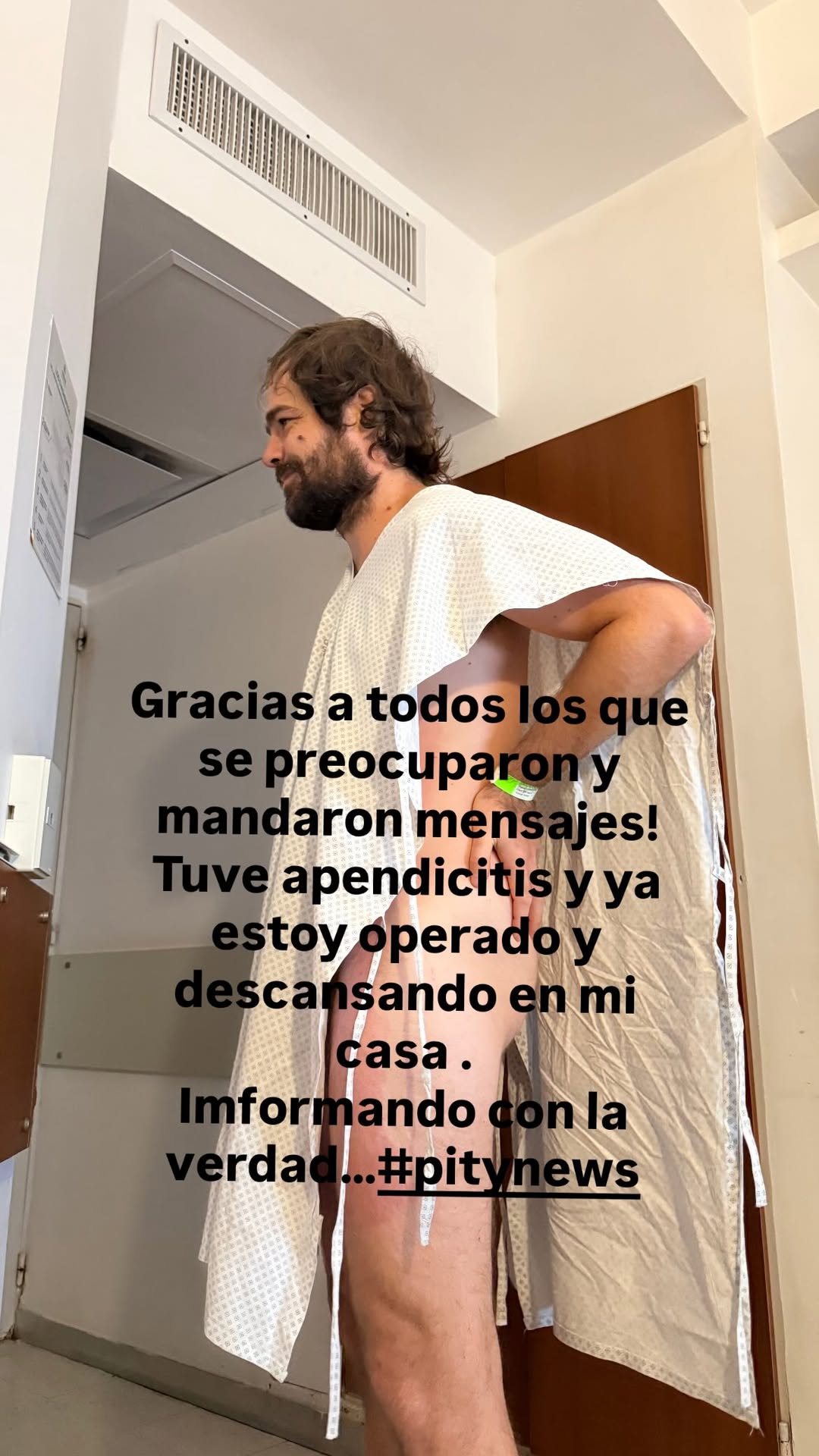 Desde su cuenta de Instagram, compartió una foto con camisolín hospitalario y tranquilizó a sus seguidores: “Gracias a todos los que se preocuparon y mandaron mensajes. Tuve apendicitis y ya estoy operado y descansando en mi casa. Informando con la verdad… #pitynews”.