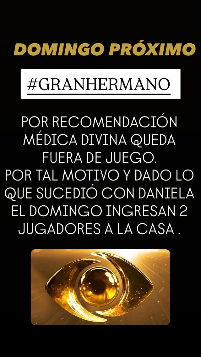 “Por recomendación médica Divina queda fuera de juego”, comunicó el conductor, confirmando que la artista no podrá continuar en esta edición del reality.