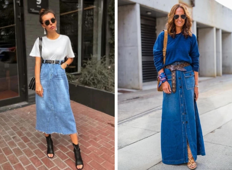 Las faldas de jean en todos sus largos serán protagonistas. Acá una con largo midi que combina con una remera básica blanca. Un look clásico pero con toques modernos a la vez.
