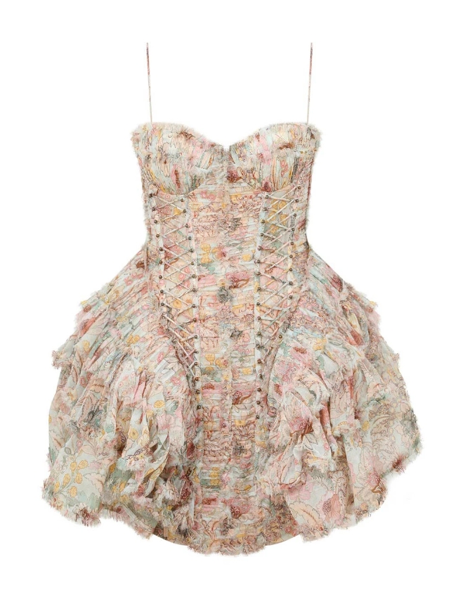 El look pertenece a Zimmermann, la prestigiosa marca australiana reconocida a nivel internacional por su estética femenina, floral y artesanal. El vestido está confeccionado en seda, presenta un delicado estampado floral, una silueta coquette y un corset estructurado que marca la figura, convirtiéndolo en una pieza tan elegante como llamativa.