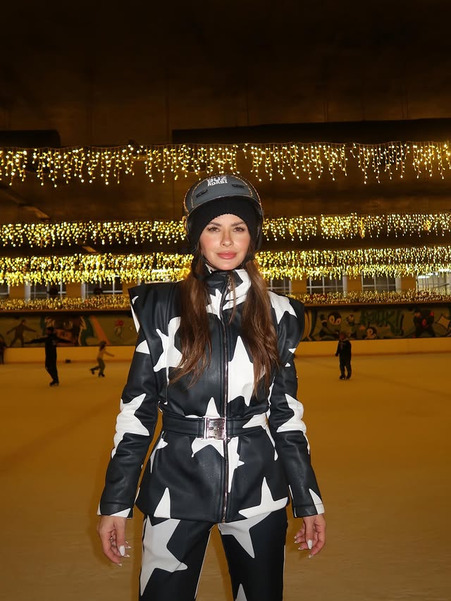 El outfit estuvo compuesto por un conjunto negro con estrellas blancas, realizado en material térmico y ajustado al cuerpo, ideal para la actividad sobre hielo. Completó el look con calzas, abrigo técnico y accesorios de seguridad como casco y guantes. No se trató de un traje de esquí, sino de un outfit específico para patinaje, con una estética limpia y moderna.
