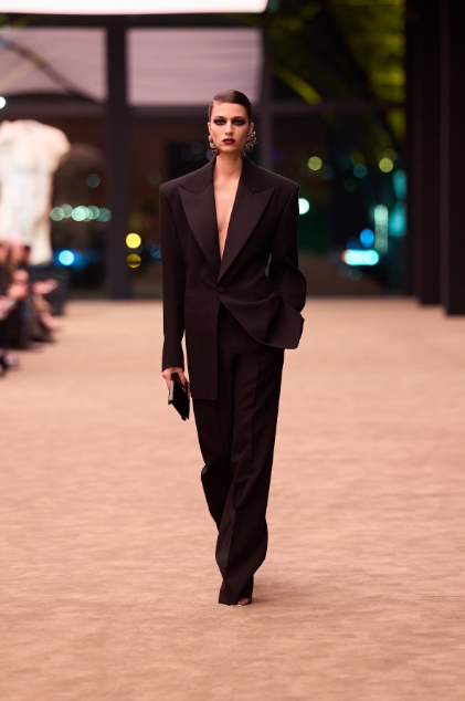 Los trajes amplios volvieron a dominar las pasarelas. Blazers largos, hombros marcados y pantalones holgados marcaron una silueta relajada que mezcla elegancia clásica con una estética moderna.